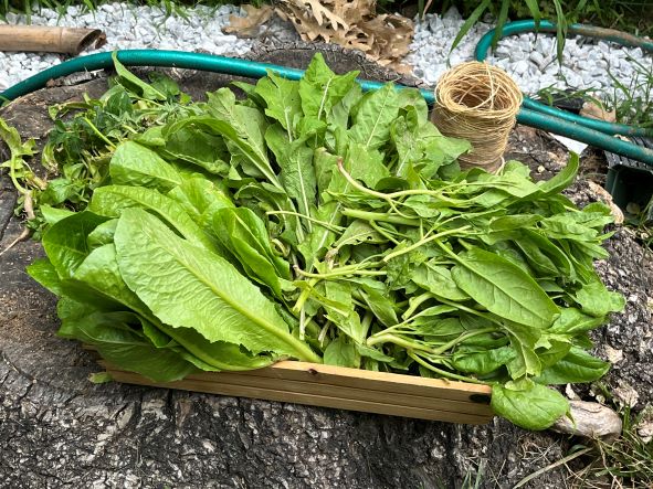 7/2/22 – Harvested all spring lettuce: Romain (left), spinach (center), arugula (right) since it is getting ready to bolt. The harvest was about 2 lb total for all three lettuces, and the romaine only developed a small head of leave for each plan. While disappointing considering the time and effort devoted, it is encouraging given that I haven’t had any harvest since the garden has been in this location. It will yield a few salads, and the arugula will go even further because I use it sparingly. The most likely cause of the low yield are the late date for planting and the lack of adequate irrigation early (the drip line wasn’t installed right away). We could also have had an overcrowding issue as well as a lack of adequate feralization early in the process. So bottom line, I’m happy with the results, but also expect improvement in coming seasons.